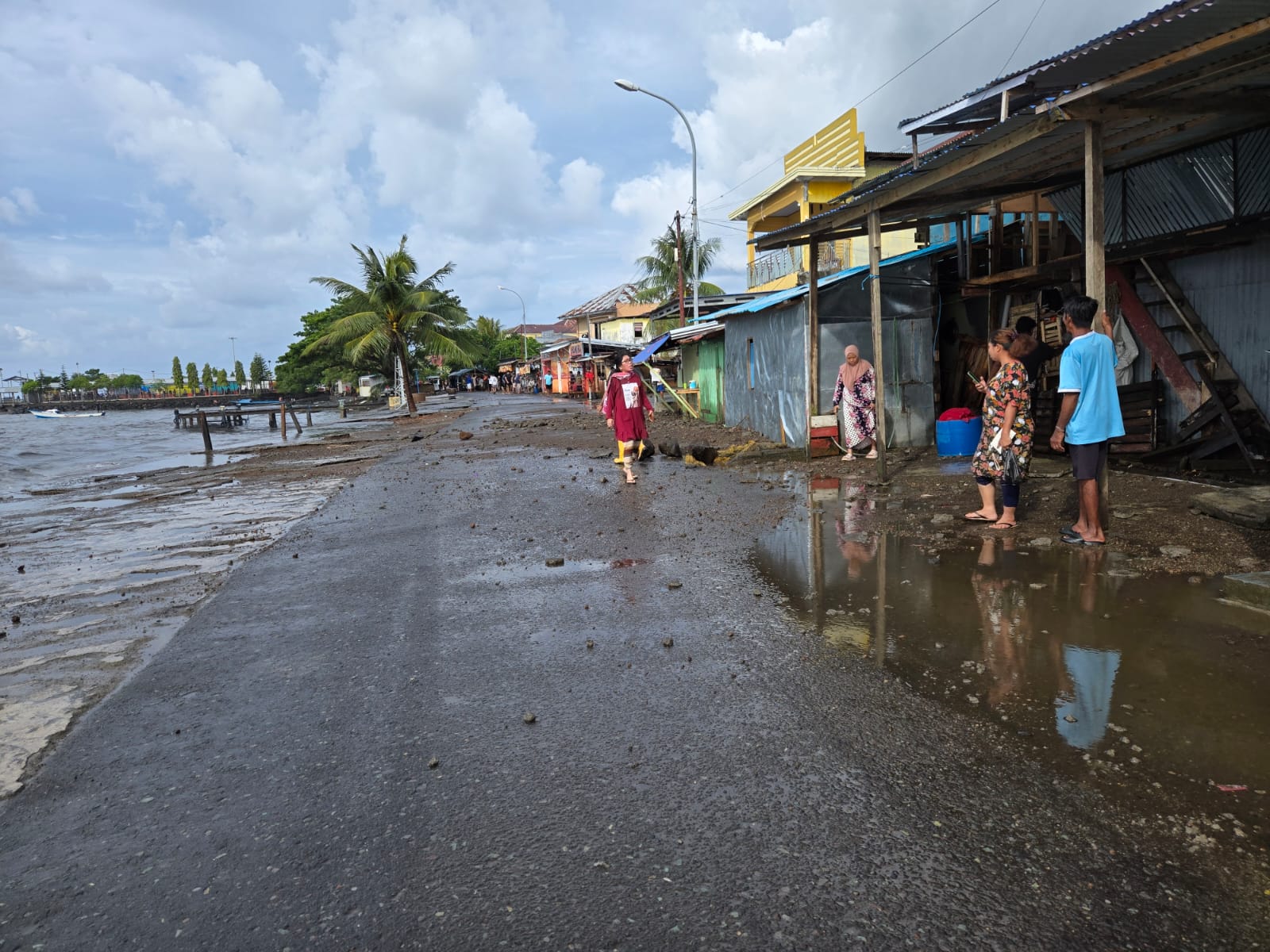 Hasil Pantauan tabausnew.com, Selasa (7/10/2025) terlihat  pemandangan pesisir di Bastiong, kelurahan Bastiong Karance setelah air pasang tinggi, mengakibat jalanan terlihat basah dan tertutup puing-puing, dan ada genangan air di beberapa tempat.