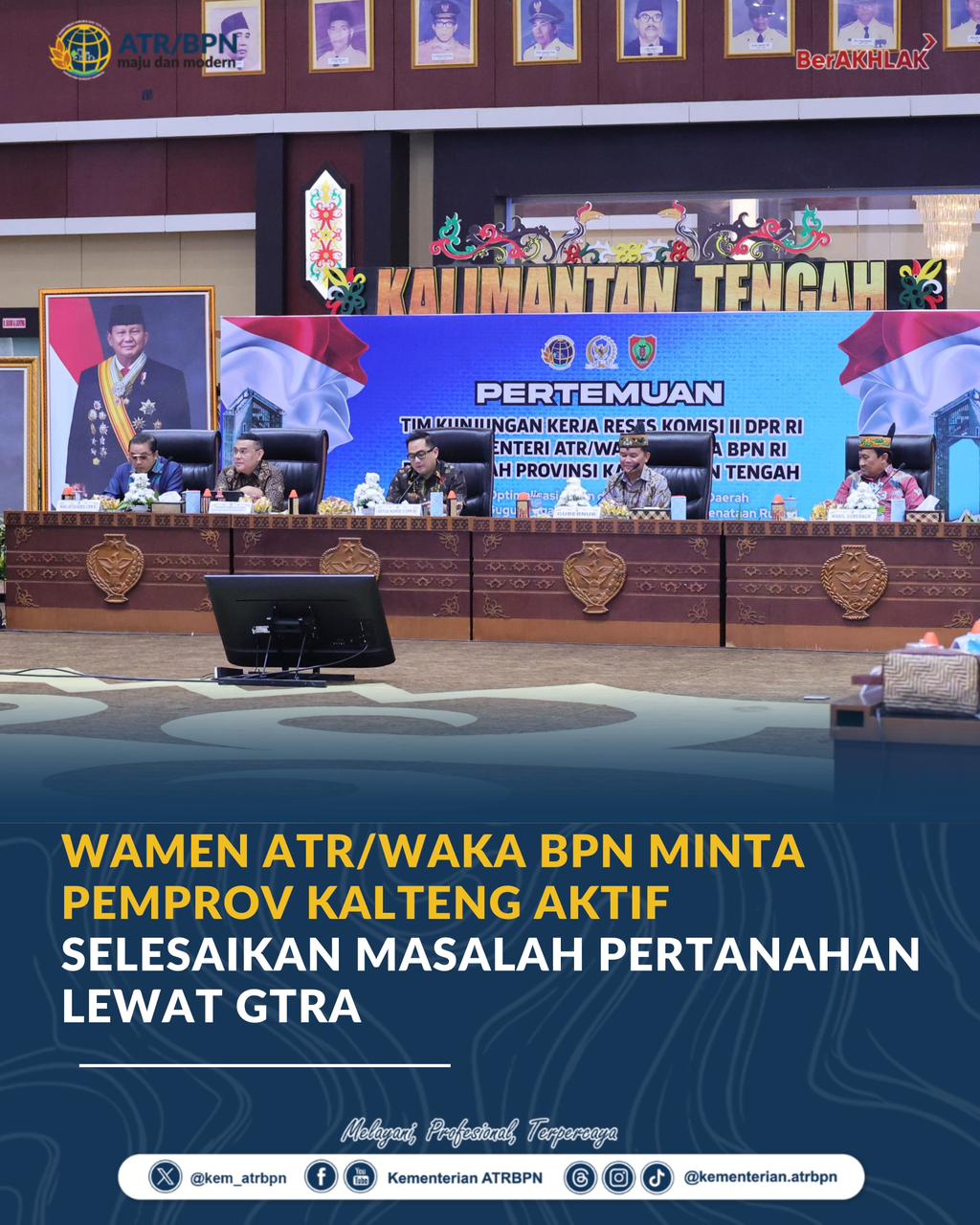 PALANGKARAYA – Wakil Menteri Agraria dan Tata Ruang/Wakil Kepala Badan Pertanahan Nasional (Wamen ATR/Waka BPN), Ossy Dermawan, dalam Kunjungan Kerja Reses Komisi II DPR RI di Kalimantan Tengah (Kalteng), Kamis (23/04/2026), mengimbau pemerintah provinsi (Pemprov) untuk lebih aktif menyelesaikan masalah pertanahan. Langkah itu bisa dilakukan dengan memanfaatkan Gugus Tugas Reforma Agraria (GTRA).