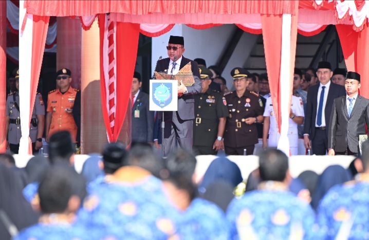 TERNATE – Wali Kota Ternate M Tauhid Soleman, pimpin upacara Hari Ulang Tahun (HUT) ke-27 Pemerintah kota (Pemkot) Ternate, di Halaman Kantor Wali Kota, Senin (27/4/2026). Upacara tersebut dihadiri Ketua TP PKK Marliza M Tauhid, Forkopimda, Tokoh Agama, Tokoh Masyarakat, Kepala Bank Indonesia, Sekda Kota Ternate, Anggota DPRD Kota Ternate.