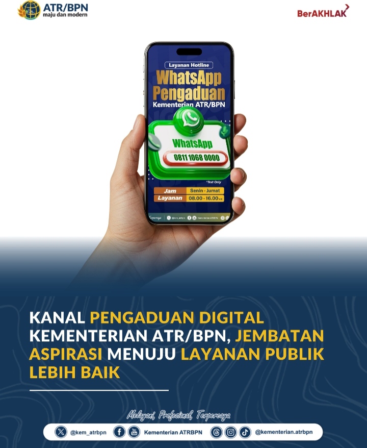 JAKARTA – Pada era digital yang menuntut keterbukaan dan akuntabilitas, Kementerian Agraria dan Tata Ruang/Badan Pertanahan Nasional (ATR/BPN) terus bebenah untuk meningkatkan kualitas layanan, salah satunya dengan memberikan kemudahan layanan pengaduan masyarakat. Berbagai kanal digital pengaduan disediakan sebagai jembatan bagi masyarakat untuk menyampaikan keluhan, aspirasi, atau dugaan pelanggaran dengan lebih cepat dan mudah.